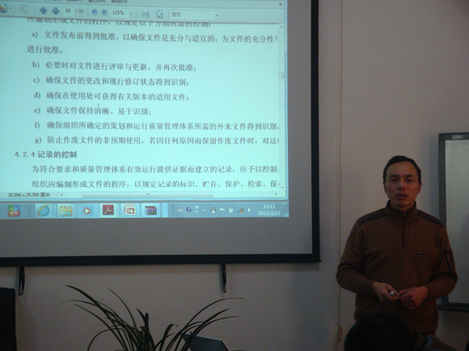 3.23日,公司聘請ISO9000管理體質(zhì)培訓講師王兵老師對全體職員進行培訓學習。王老師以其豐富的現(xiàn)場管理經(jīng)驗,領導完成多項生產(chǎn)、質(zhì)量技術改造工程;策劃和推行以過程為導向的質(zhì)量有效控制與現(xiàn)場持續(xù)改善活動,解決公司產(chǎn)品的關鍵質(zhì)量問題,大大提高了產(chǎn)品的合格率。王老師在生產(chǎn)管理、質(zhì)量管理培訓領域有豐富的授課經(jīng)驗,講授公開課暨企業(yè)內(nèi)訓三百多次。講課主要特點是能針對不同的企業(yè)特點、學員層次、結合企業(yè)的實際情況采用不同的授課方式和內(nèi)容。