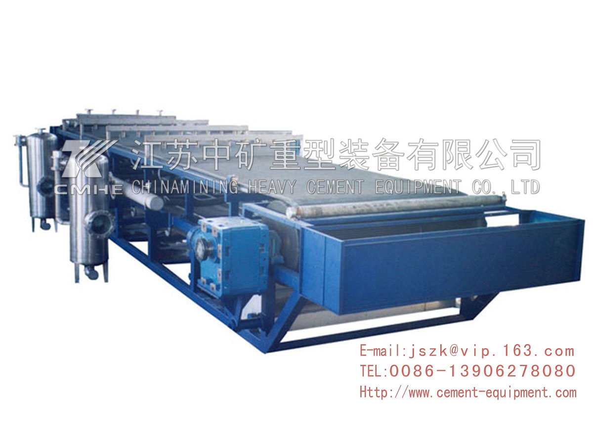 真空皮帶脫水機是一種用來分離固—液兩相組成的各種懸浮物的迅速過濾和脫水的高效分離設備。它主要由橡膠帶、驅動輥、張緊輥、真空室、進料裝置、濾餅洗滌裝置、卸濾餅裝置、濾布糾偏裝置、濾布張緊裝置、驅動裝置,濾帶洗滌裝置、控制箱等組成。該機結構先進,采用高強度的橡膠帶及濾布帶在機上既作環狀過濾帶,又作輸送帶。工作時物料由進料裝置均布到移動的濾帶上,在真空作用下形成濾餅,依次經過過濾、洗滌、脫水、卸餅、濾布和濾帶洗滌完成循環。